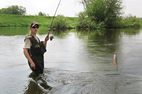 Неплохие результаты показывает такой метод, как ловля взаброд. При таком способе голавль не пугается рыболова и смело идет на атаку приманки. Очень важно правильно подобрать экипировку, которая смогла бы защитить спиннингиста от воды и насекомых. Приманку подбирают поменьше, а в остальном техника ловли, места обитания, поклевки такие же, как и на крупных реках.