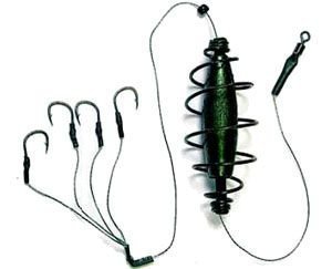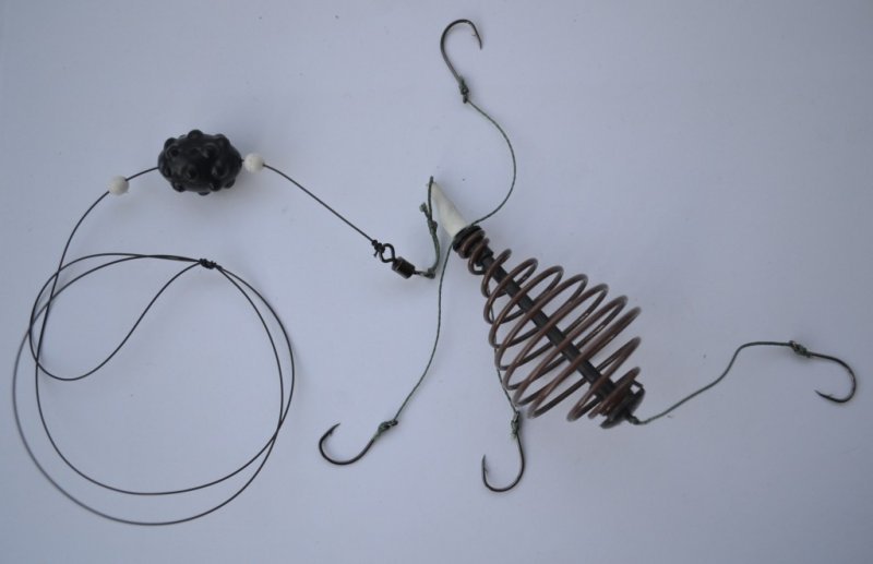 Основным элементом такой снасти является кормушка, напоминающая по форме пружину, изготовленную из проволоки диаметром, где-то 2мм. Крепится пружина к концу лески, а рядом крепятся поводки с крючками. Их можно крепить непосредственно к пружине или к основной леске. Здесь, главное, чтобы поводки были надежными и смогли выдержать поклевки такой мощной рыбы, как карп. Карп кормится таким образом, что засасывает корм в рот, где он определяет, какой съедобный, а какой нет. Вместе с прикормкой, рано или поздно, карп засасывает и крючки. Пружина играет роль не только кормушки, но и грузила, причем вес можно подобрать любой, в зависимости от типа рыбалки.