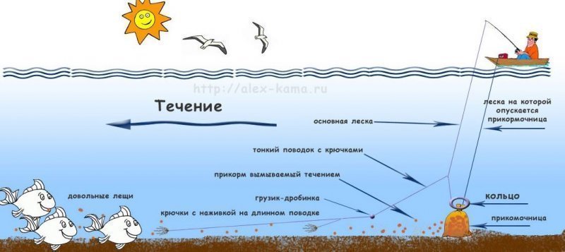 Отыскав похожее место, нужно закрепить лодку, использовав для этого, две точки крепления: два якоря или один якорь и дерево, растущее на берегу. Учитывая, что это течение, то крепление должно быть надежным. После этого кормушка наполняется прикормкой и забрасывается в воду.