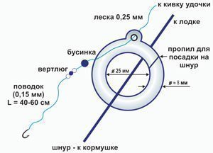 После того, как найдено соответствующее место на реке и лодка зафиксирована, с помощью якорей, можно забросить кормушку с прикормкой и привязать ее к лодке. После этого можно соединить удочку с кормушкой. Для этого кольцо, не много разъединяется и пропускается через леску или шнур, с помощью которого закреплена кормушка, после чего, кольцо опять прочно смыкается, чтобы леска или шнур не рассоединились во время рыбалки. Можно представить такой механизм: леска удочки скользит по маленькому отверстию кольца, а кольцо, вместе со всей снастью, скользит по леске или шнуру кормушки, доставляя в место кормления рыбы крючки с наживкой. Опускаясь на дно, кольцо упирается в кормушку, а поводки с крючками и насадкой, под действием течения, вытягиваются вдоль прикормочного пятна.