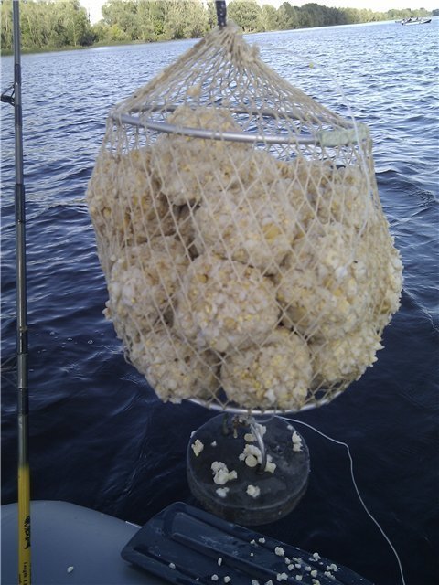 Кормушка изготавливается из овощных сеток, имеющих ячейки, размером не более 5мм. На дно кормушки укладывается килограммовый груз. После опускания на дно, она привязывается к лодке, для чего можно использовать толстую леску (диаметром 1мм) или рыболовный шнур из капрона.