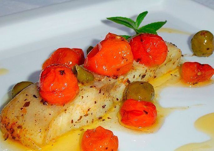 - Сверху выкладывается мясо рыбы, на которую высыпаются оставшиеся лук и томаты.