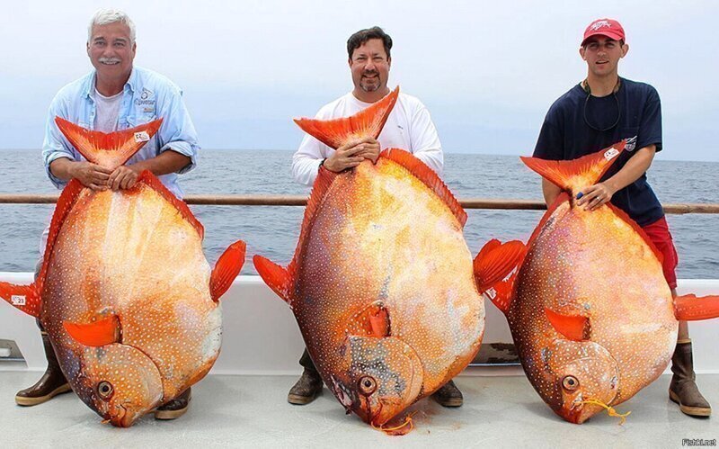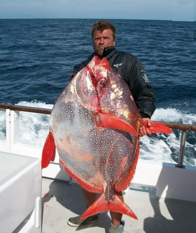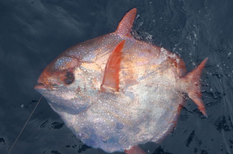 Тем не менее, по словам исследователей, опах вовсе не похож на ожесточенного хищника. Эта пузатая метровая рыба плавает за счет грудных плавников, обитает на глубине 50–200 метров, питается кальмарами и более мелкой рыбой.