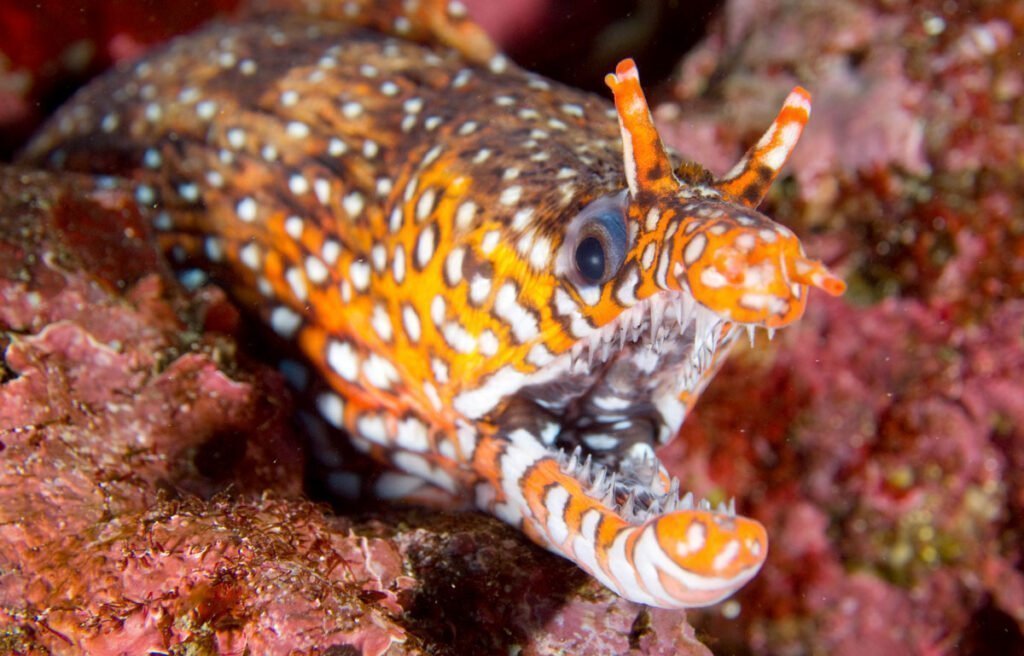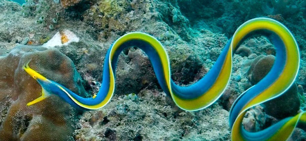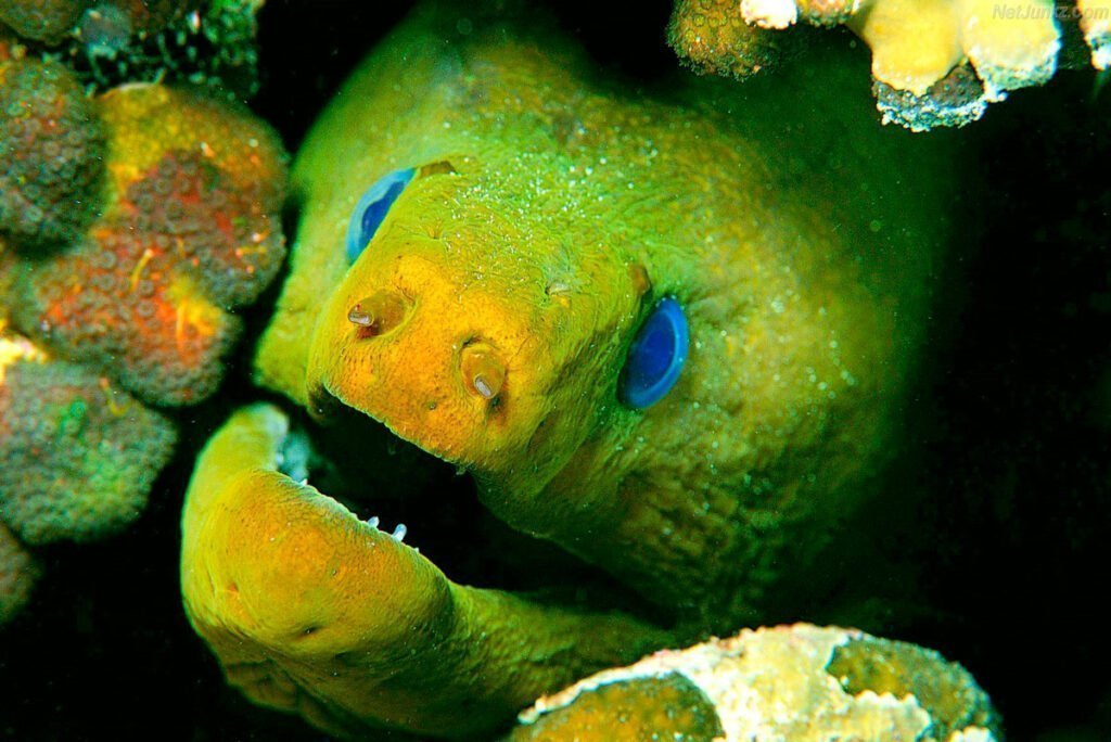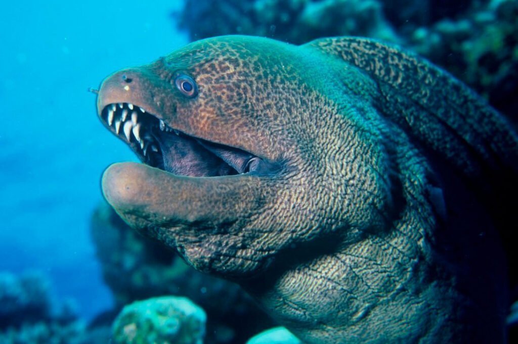 По внешнему виду эти рыбы напоминают своих близких родственников — угрей, но у мурен более крупная, хищническая морда.