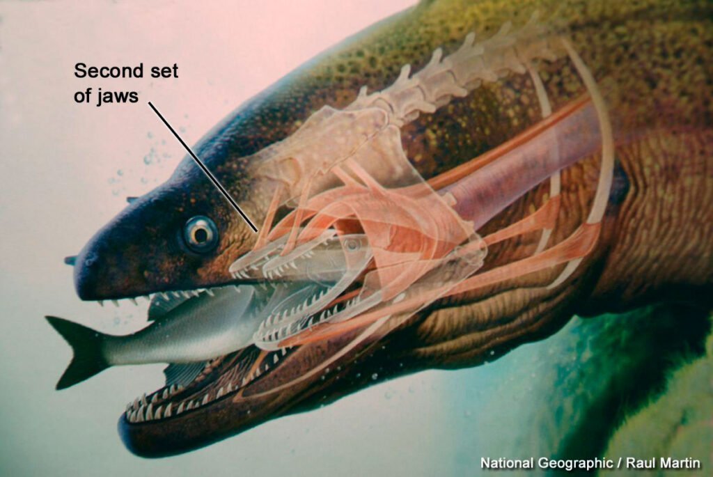 Интересны и сами зубы на вторых челюстях, они могут складываться, чтобы не мешать проскальзыванию пищи внутрь, заодно такое складывание способствует сохранности самих зубов.