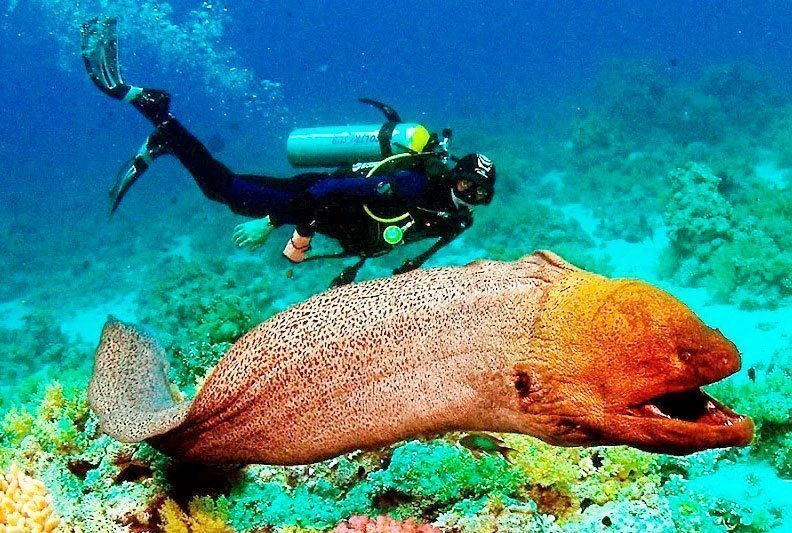 Опасна ли мурена? Зависит от обстоятельств. Были случаи, когда мурены кусали в руку людей, которые потрошили на берегу рыбу, то есть эти хищники реагировали скорее на движение, запах крови и потрохов, а руку, вероятно, принимали за осьминога (любимую пищу мурен).
