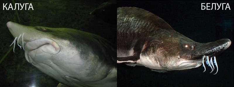 - У Калуги - усики не имеют листовидных придатков, у Белуги - хорошо видны листовидные придатки вдоль каждого усика.