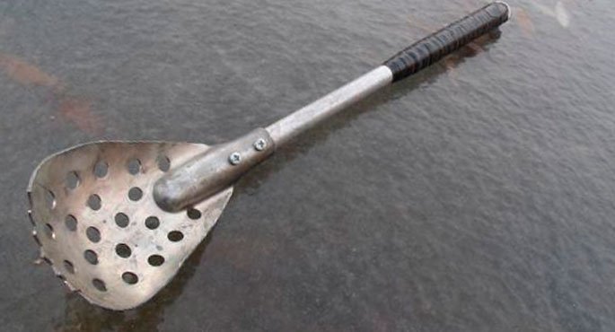 Так же необходимое приспособление. Не очень-то и комфортно выбирать ледяную крошку из лунки голыми руками, тем более на морозе, да еще и в ветреную погоду. И здесь черпак, сделанный по типу кухонного дуршлага, будет незаменимой вещью. Черпак можно сделать самому, приспособив для этого кухонный черпак, а можно и купить. Выбирать следует среди легких разработок и с деревянной ручкой. Если черпак случайно упадет в воду, то всегда останется на плаву.
