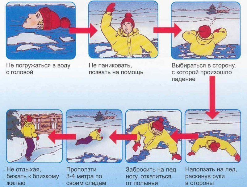 - Чтобы помочь человеку, провалившемуся под лед, необходимо ползком подобраться к этому месту и бросить ему что-то, вроде веревки (можно шарф и т.д.).