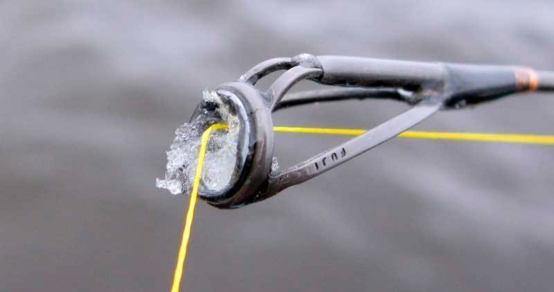Чтобы исключить промерзание шнуров и обмерзание лески на морозе перед рыбалкой их поверхность должна обрабатываться с помощью водоотталкивающих составов. В противном случае замерзший шнур станет хрупким и может легко порваться. Водоотталкивающим составом нужно покрывать и поверхность пропускных колец.