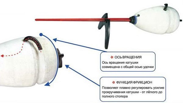 Комель удочки «Фаберже», по форме напоминающий яйцо, изготовлен из пенопласта и хорошо ложится в руку. Для укладки лески на катушку имеется специальное устройство — лескоукладыватель. Она просто незаменима, если вы собираетесь ловить на безмотылку.