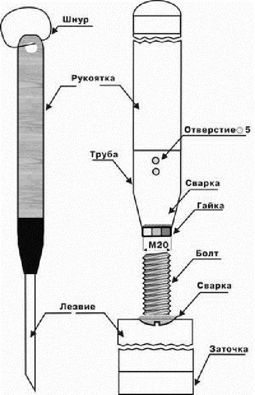 Предлагаем еще один вариант исполнения пешни. В головке болта М20 выполняют прорезь, куда крепят часть рессорного листа. Лист сваривают. На болт прокручивают две гайки М20, которые тоже соединяют сваркой. Нужен кусок трубы длиной до 1 метра и диаметром 45 — 57 мм. Гайки приваривают к отрезку трубы. Наконечник затачивают с одной стороны. В верхней части трубы предусматривают отверстия для рукоятки. В рукоятке просверливают отверстие, предназначенной для веревки. Длина рукоятки выбирается по вашему усмотрению.