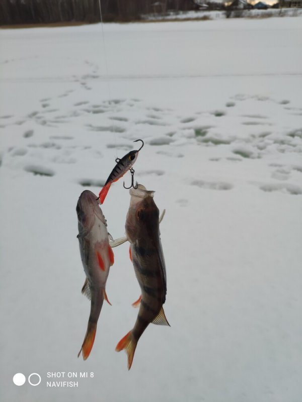 Время уже приближалось к вечеру. Товарищ поспешил домой. Я же поставил балансир и решил проверить клюет ли на него. Опускаю в лунку. Пошли удары. Подсек. Вытащил дуплет. Так, что берет. В следующий раз попробую на балансир тоже половить.