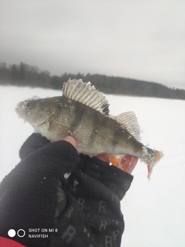 Но, поскольку озадачен был поиском окуня этим и занялся. Посмотрел Навионикс, хоть он и врет, все равно дает какую-то картину дна. Мне понравились места направо от стоянки. Пупки, крутые кромки, поливы. Туда и двинул через мыс. На мысу пробурил несколько лунок. Стоял мелкий, как говорят, спортивный окунь. Ловить его не интересно. Шпингалеты бегают за блесной вверх вниз, изредка заглатывая тройник, который приходится долго и аккуратно извлекать, дабы не искалечить. Я их всех отпускаю обратно подрастать.