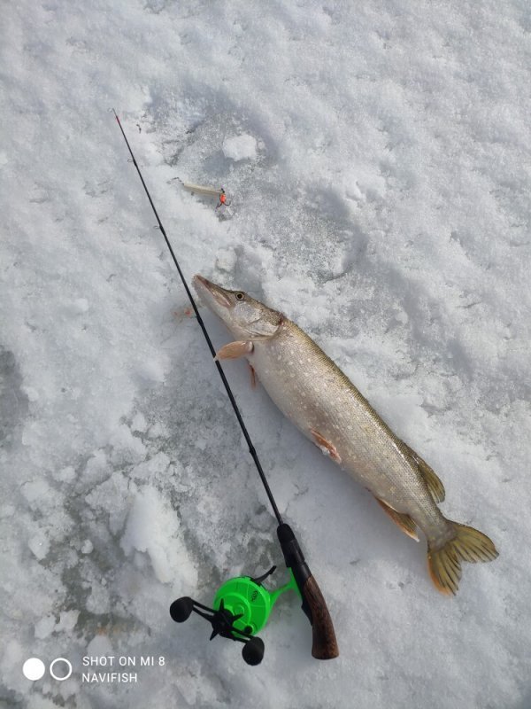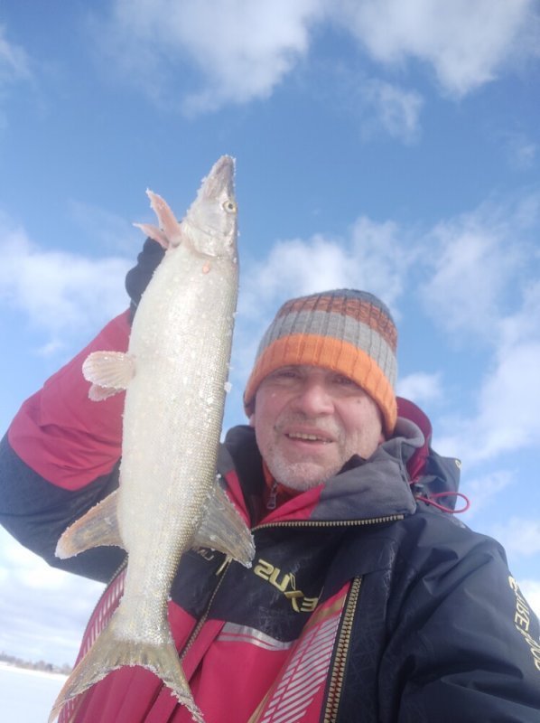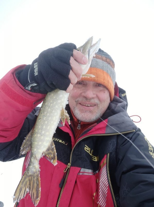 Я вспомнил свой старый прием, который использовал когда -то в Финляндии при ловле судака. Суть его в том, что вы опускаете блесну, кладете на дно и начинаете ею стучать. Рыба внизу от этого действия оживилась, подчас поднимались за блесной несколько штук. В конце концов, на семи с половиной метрах, после стучания по дну и медленного подьема, за блесной пошла жирная полоска. Я, медленно раскачивая ее плавно, без резких ступенек, поднял на полметра. И, тут последовала резкая поклевка. Первая мысль, ну наконец-то, я раззадорил хорошего судака. Рука машинально подсекла. Внизу подо льдом почувствовалось сильное сопротивление. Бросив удочку на лед, второпях забыв, что надо вываживать катушкой, схватил леску руками. Сколько раз у меня это присходило! Ну, никак не привыкну. Все рано ловлю по старинке). Рыба билась серьезно. Хороший судак, подумал я. Тут, леска запуталась о провод Практика. Дабы не ослабить ее, одной рукой пытаюсь распутать леску, а другой перехватываю ее пальцами и держу выше для натяга. Мне это удается, и вот в лунке появляется морда щуки. Мать вашу! Что ты делала на такой глубине? Хорошо, что не откусила любимую блесну! Я бы не пережил)).