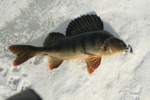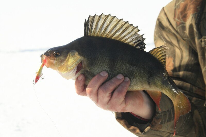 В устье ручья, там где он впадает в озеро, мерный окунь знакомился с балансирами на предмет съедобности.