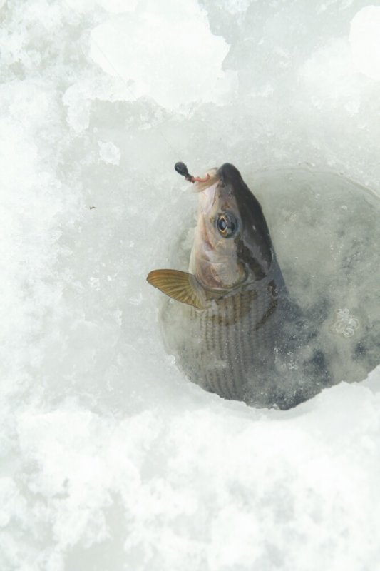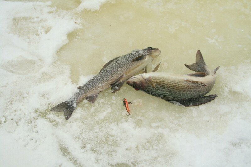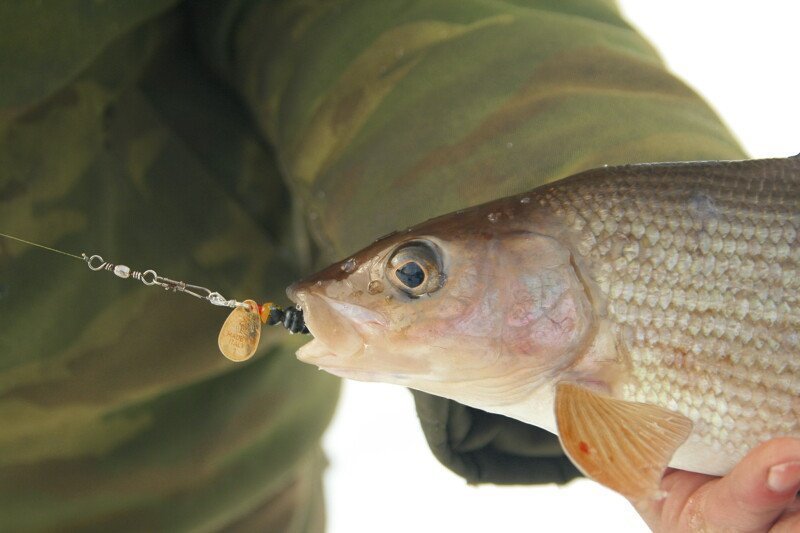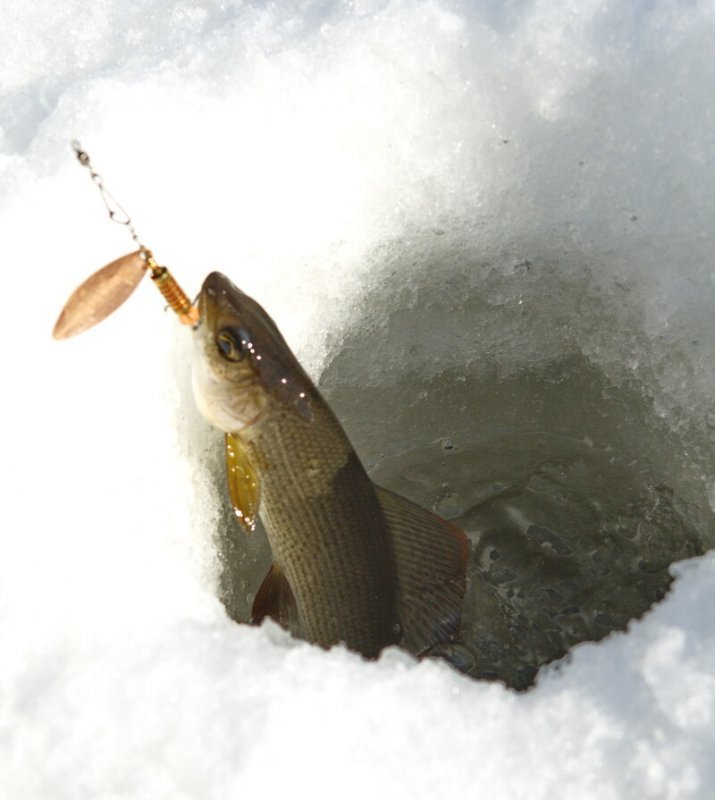 Особенности местной рыбалки в том, что рыба готова брать даже на те приманки, которые у нас посчитали бы нерабочими в зимнее время, например, блесны вертушки. Они работают на озере и на реке, главное подобрать скорость вертикальной проводки. И ты даже не сможешь предсказать, кто их атакует. Потому что на реке их помимо щуки уважает хариус.