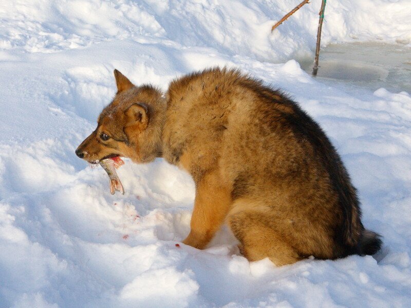 Кстати местные собачки возле зимовья сидят на диете из плотвы и язей и не жалуются.