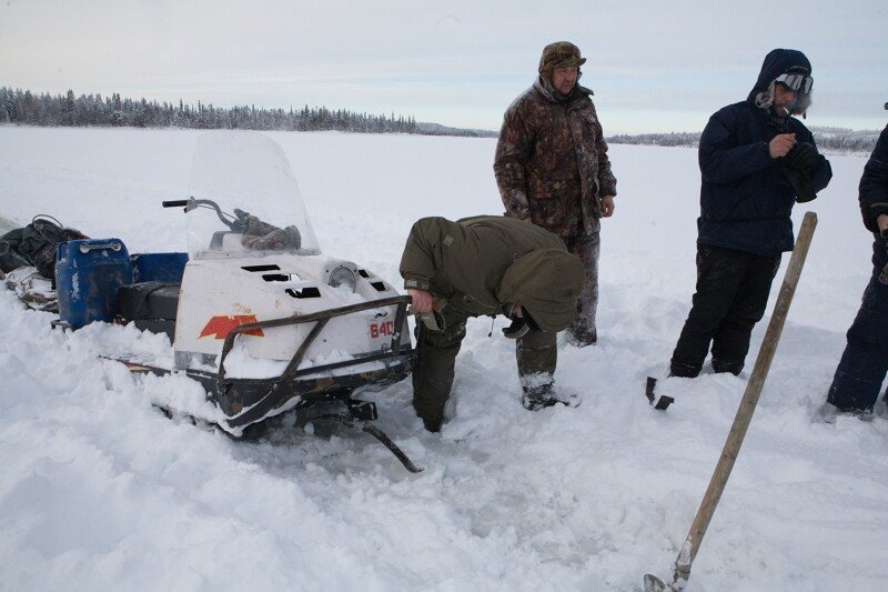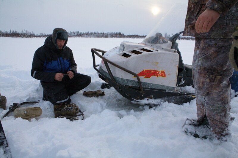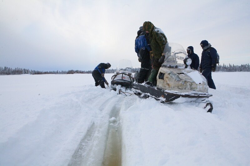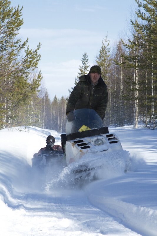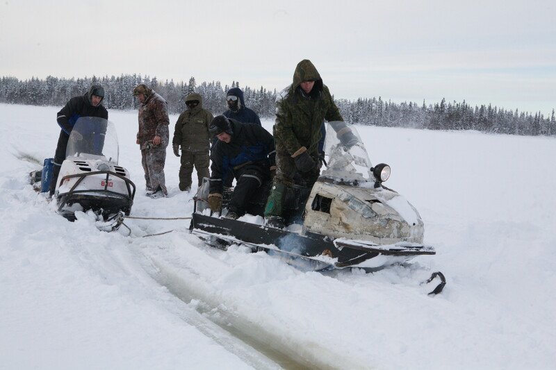 Все перемещения до зимовий происходят караваном Буранов. Первый едет пустой, проминает колею, остальные с прицепами. В прицепах вещи, люди, горючее и запасные части. Дело в том, что в глухозимье, не смотря на мороз в -20 или -30 с лишним, и метровый снег, вода на ручейках, озерах и реках выступает поверх льда под весом снега. Первая машина проскакивает, а идущие следом уже черпают снежную кашу и стоит первой машине утонуть в снегу, весь обоз останавливается. Люди выходят и помогают освободить Буран из снежной ловушки. Пока раскопали, раскачали, пересели в свои снегоходы и сани, начинается самое интересное. Остальной караван постепенно вмерзает в лед. Тут приходится ближайший снегоход брать на буксир, дергать за лыжу веревкой, потом отцеплять сани, переворачивать Буран на бок и откалывать катки от льда. Затем откалывать и дергать сани, по местному керёжу, у которой металлическое днище очень любит вмерзать в лед. Затем, следующую машину, и ее керёжу, и следующую. Озер и речек тут хватает, в общем пока едешь эту сотню км от поселка, озябнуть не успеешь.