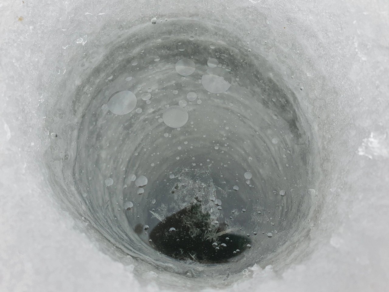 Подходим к лунке с подсолнечным маслом, и видим, что она то же замёрзла.