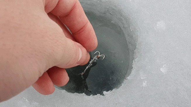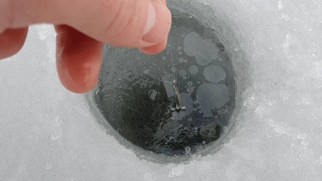 30 минут остались за спиной. Подходим к первой лунке (без масла) и видим, что вода замёрзла. Для наглядности, я положил блесну.