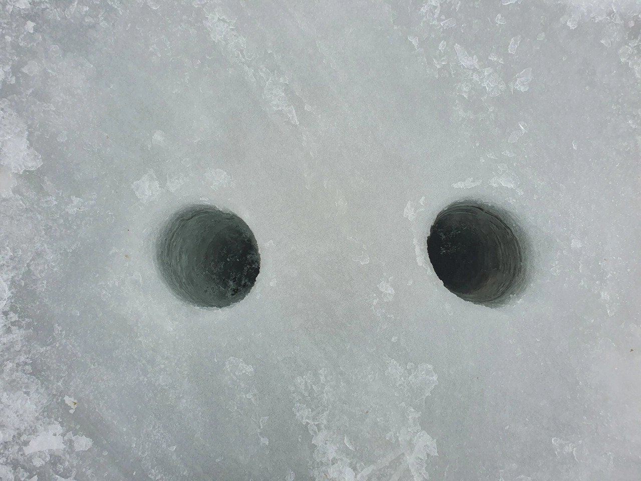 Довольно слов. Переходим к действиям. Чтобы проверить, действительно ли подсолнечное масло может избавить от замерзания воды в лунке, я просверлил во льду 2 дырки технологических отверстия.