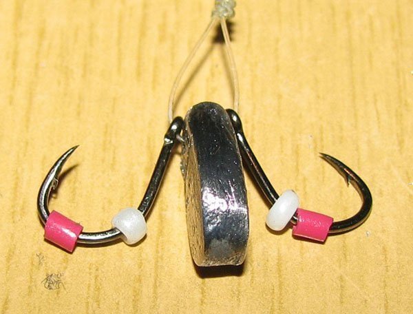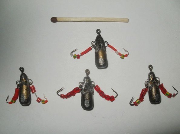 Это металлическое грузило, цилиндрической или любой другой формы, с просверленным отверстием для крепления. В это отверстие вставляется и завязывается леска. На эту леску, в непосредственной близости от грузила, крепятся два крючка. Крючки привязываются симметрично, так как вместе с грузилом они выполняют одну и ту же роль. Философия использования этой приманки такова: рыбак выполняет движения вверх-вниз, заставляя приманку их повторять, при этом «оживают» привязанные к леске крючки. В этот момент приманка похожа на водоплавающее насекомое, которое и привлекает рыбу. Во время выполнения таких движений следует иногда постучать по дну. Поднявшийся со дна ил дополнительно привлекает окуня, судака, щуку и другую рыбу. Кстати, эту приманку можно использовать и для ловли рыбы в летний период. Для того, чтобы приманка была более привлекательной на крючки, одевают разноцветные кембрики, например, черный и красный, от которых без ума окунь.