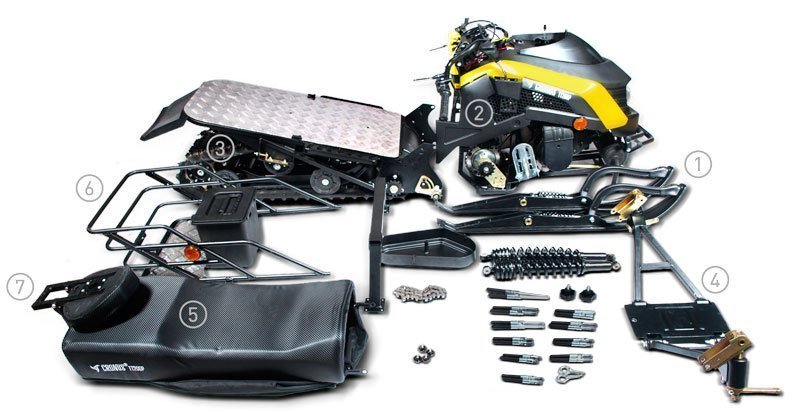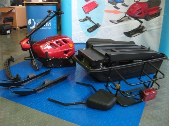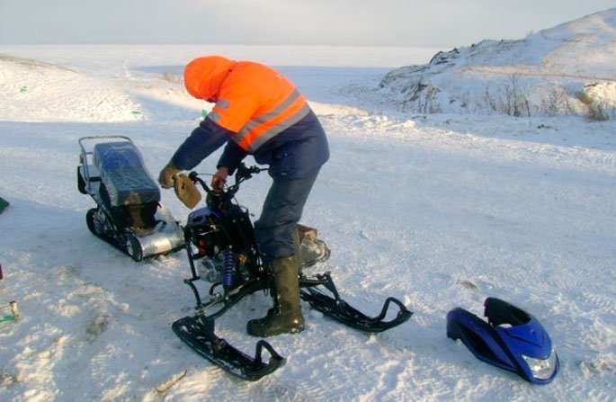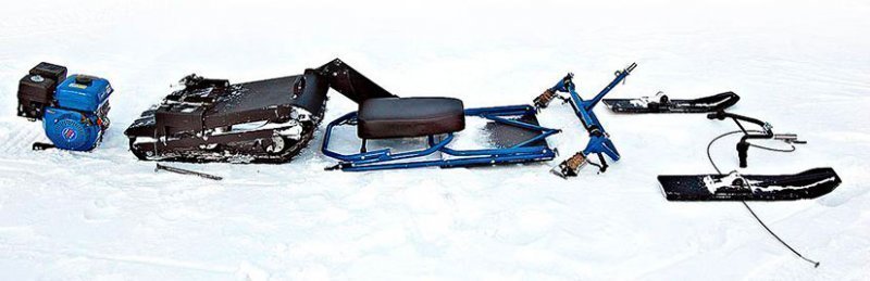 Конструкция мини-снегохода состоит из нескольких завершенных модулей, которые легко собираются и разбираются. Благодаря этому, реально упрощается процесс транспортировки этого транспортного средства.